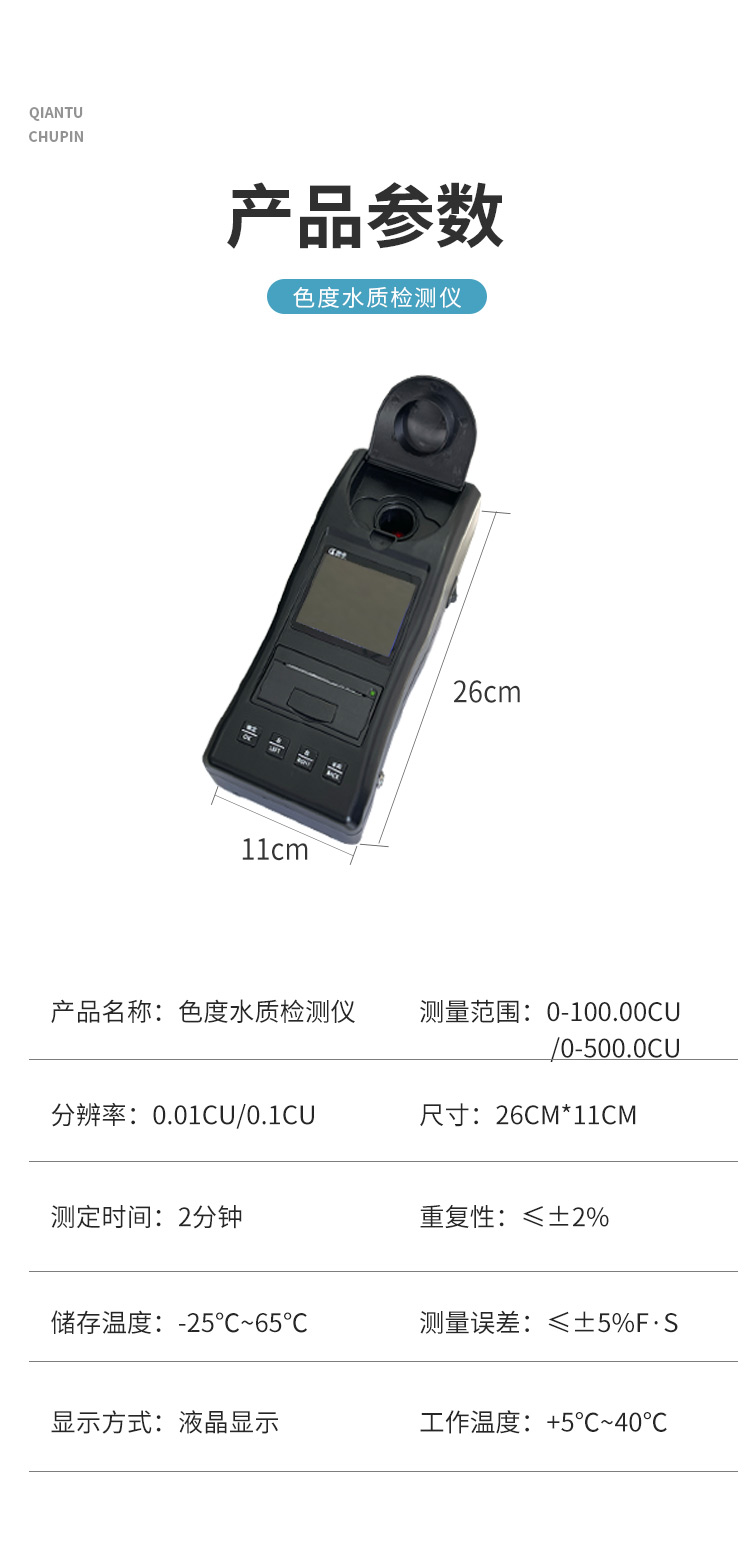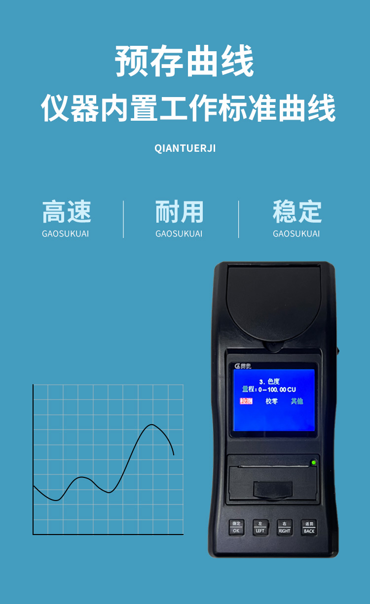 貫奧色度檢測(cè)儀可快速準(zhǔn)確測(cè)定地表水、地下水、城市污水及工業(yè)廢水中色度指標(biāo),濃度直讀;可廣泛用于水廠、食品、化工、冶金、環(huán)保及制藥行業(yè)等部門(mén)。儀器是由單個(gè)的固定波長(zhǎng)固定用途的分光光度計(jì)糅合而成的,采用分光光度法原理對(duì)各參數(shù)進(jìn)行測(cè)量,在儀器中建立不同參數(shù)的濃度顯色程度與吸光度的線性曲線,儀器通過(guò)對(duì)顏色的辨別,得出被測(cè)水樣的濃度。本儀器采用全中文菜單,操作簡(jiǎn)易易懂,使用方便快速測(cè)量準(zhǔn)確度高。